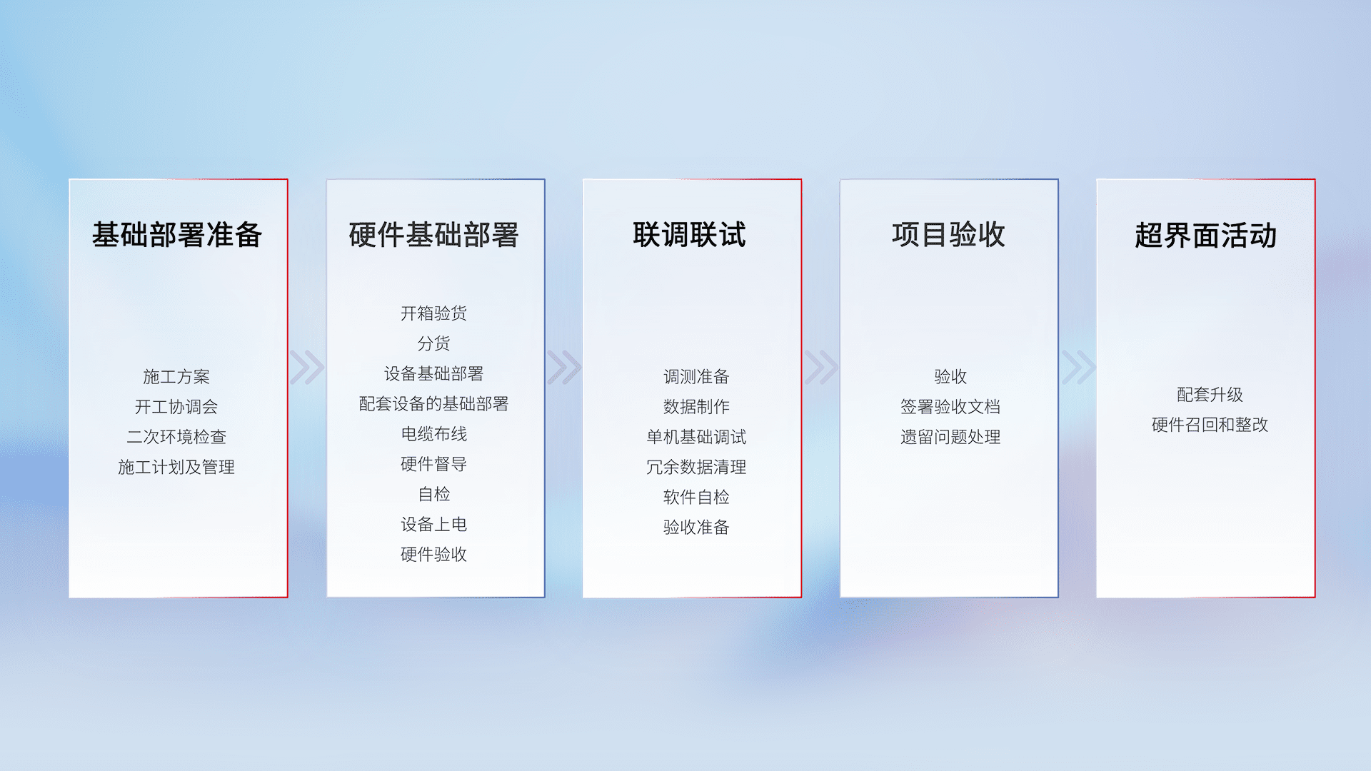 从基础部署准备、、、硬件基础部署、、、、联调联试、、项目验收、、越界面活动的全过程可追溯,,保证施工质量和进度。。
